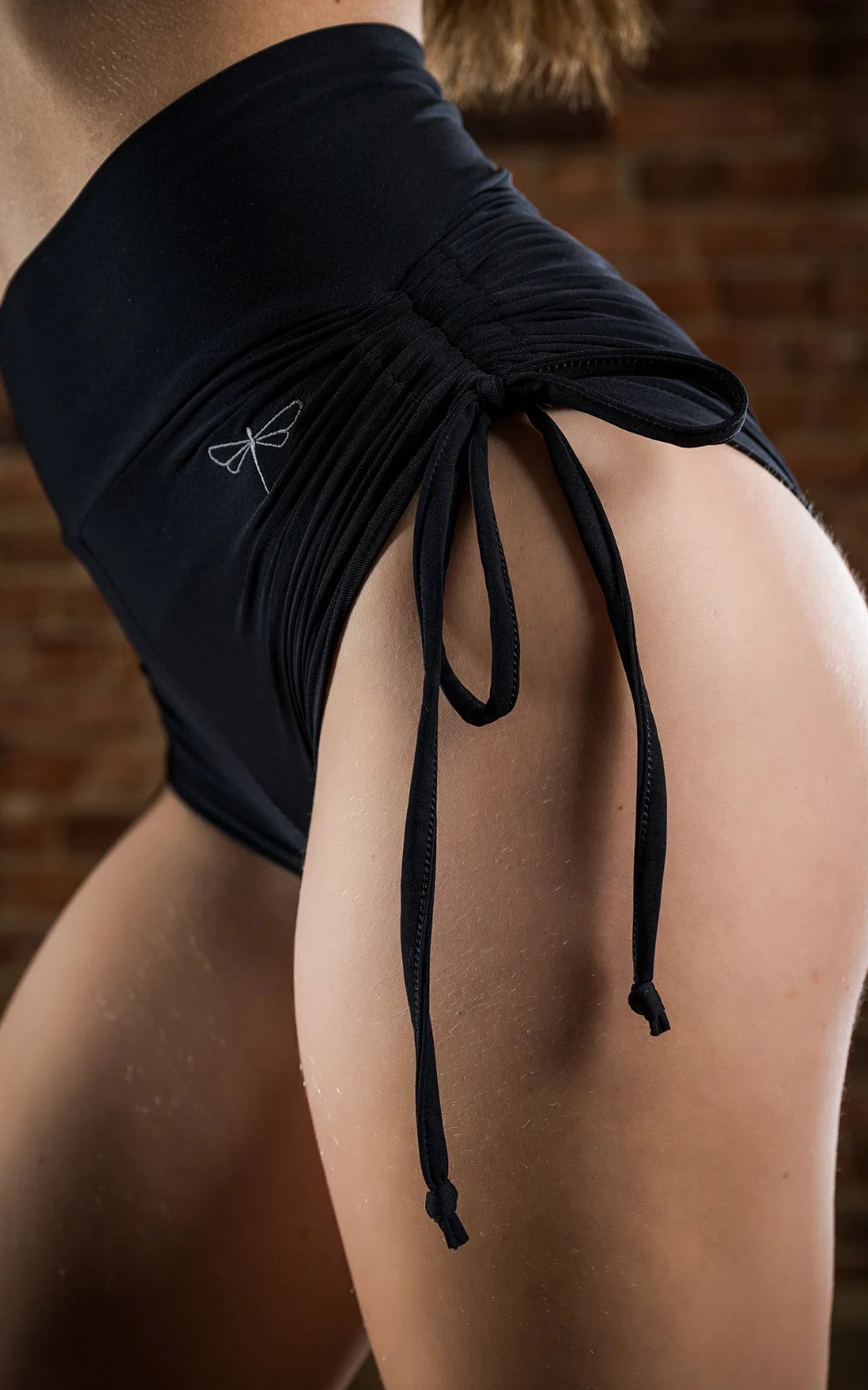 Le short polyvalent du studio. La taille haute assure le maintien, tandis que les liens réglables sur les côtés permettent d’ajuster longueur et couvrance — plus échancré pour le pole, plus couvrant pour le Bikram/Hot Yoga. La coupe seconde peau reste en place lors des climbs, inversions et séances chauffées, et couvre l’essentiel même à haute intensité. Une discrète broderie Dragonfly signe une qualité premium.